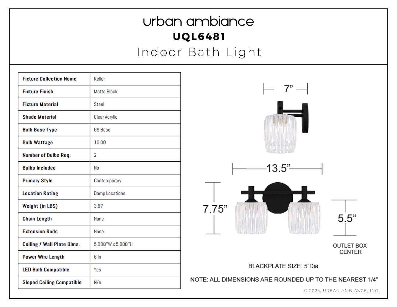 UQL6481 Contemporary Indoor Bath Light, 7.75''H x 13.50''W x 7.00''Dep, Matte Black Finish, Keller Collection