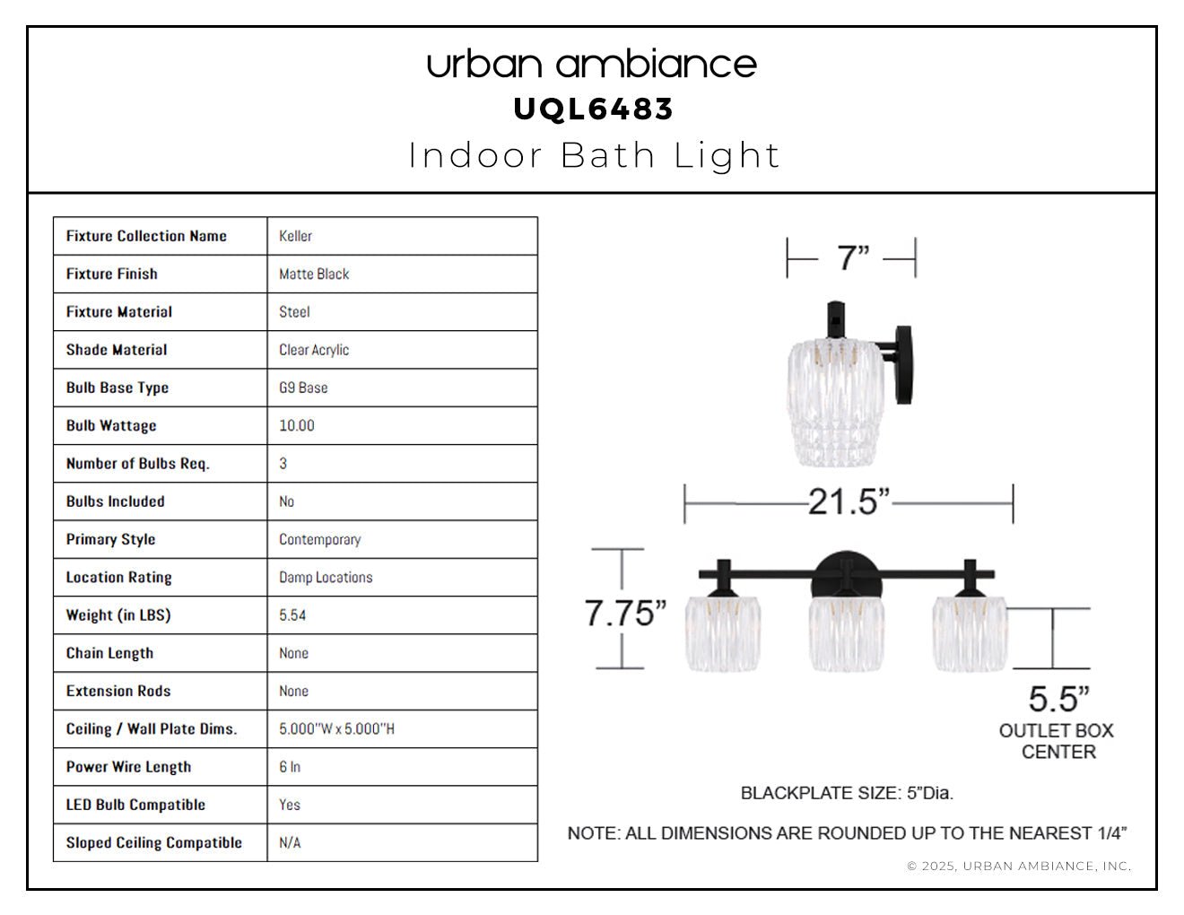 UQL6483 Contemporary Indoor Bath Light, 7.75''H x 21.50''W x 7.00''Dep, Matte Black Finish, Keller Collection