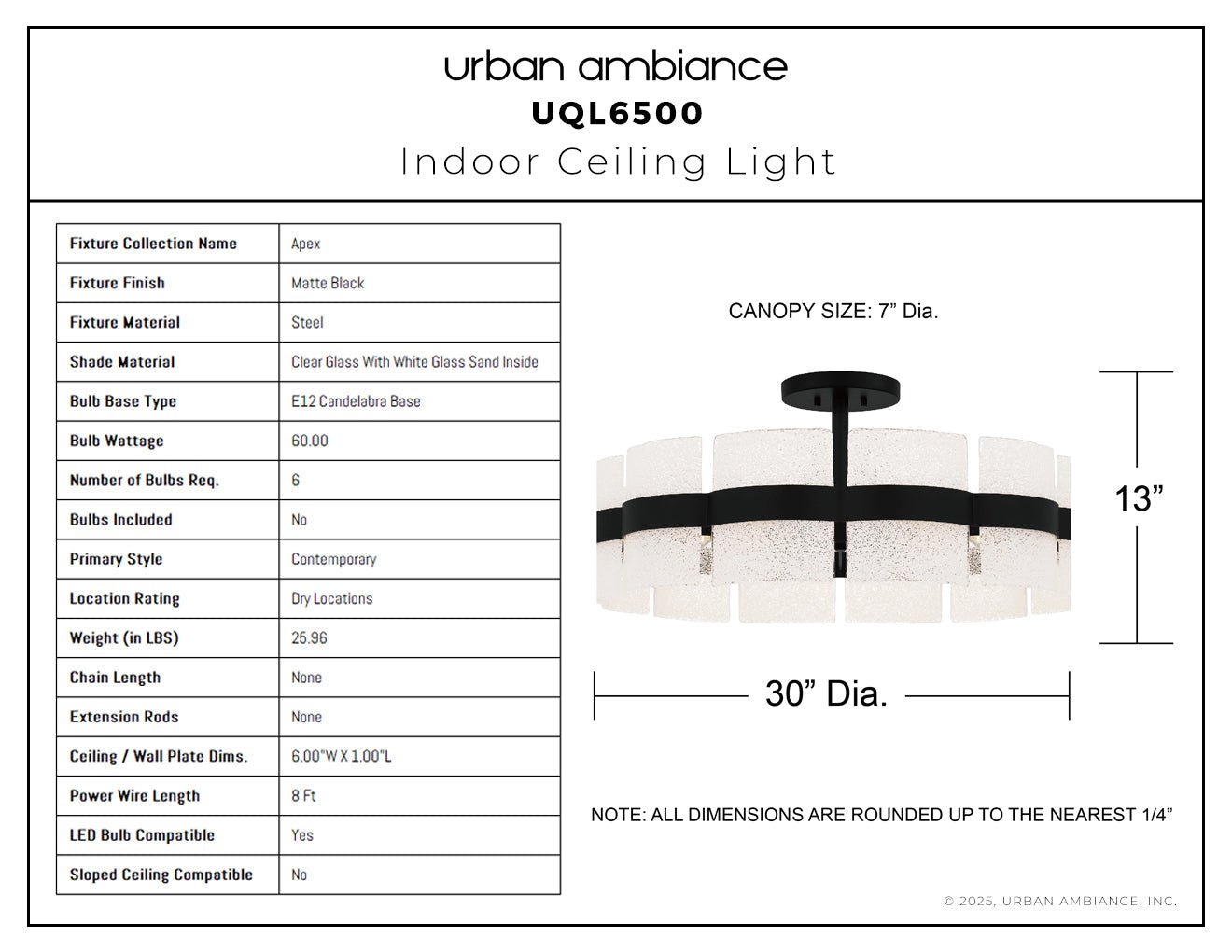 UQL6500 Contemporary Indoor Ceiling Light, 13.00''H x 30.00''W x 30.00''Dep, Matte Black Finish, Apex Collection