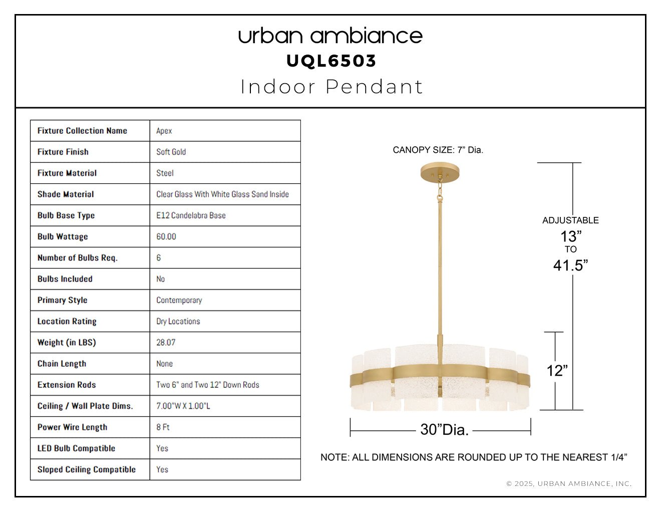 UQL6503 Contemporary Indoor Pendant, 12.00''H x 30.00''W x 30.00''Dep, Soft Gold Finish, Apex Collection