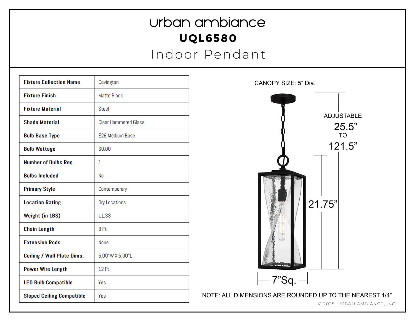 UQL6580 Contemporary Indoor Pendant, 21.75''H x 7.00''W x 7.00''Dep, Matte Black Finish, Covington Collection