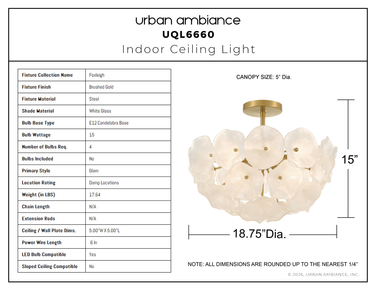 UQL6660 Glam Indoor Ceiling Light, 15''H x 18.75''W x 18.75''Dep, Brushed Gold Finish, Foxleigh Collection