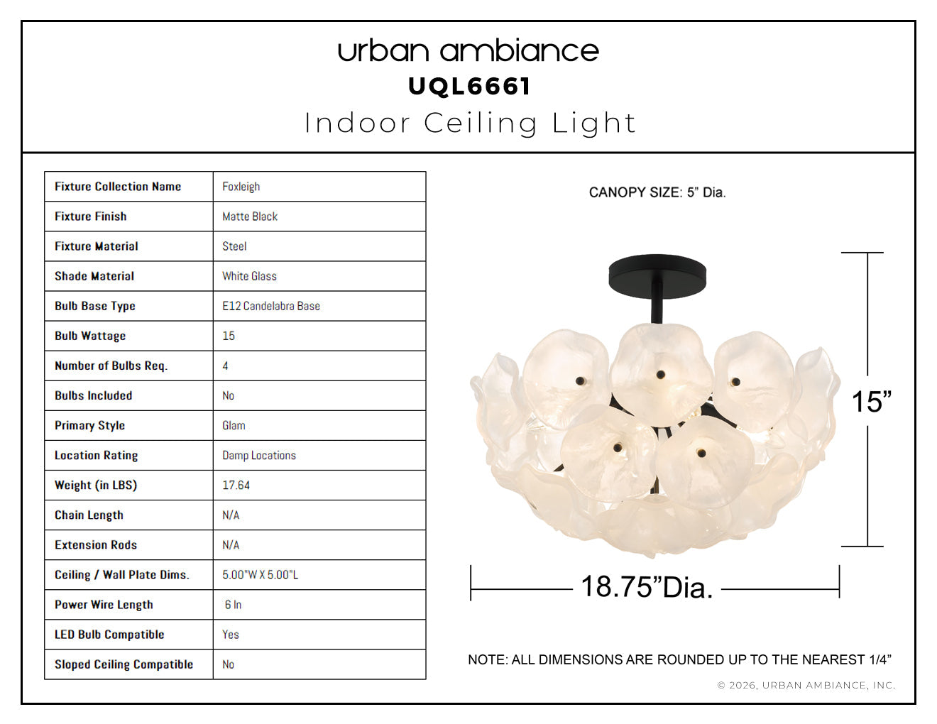 UQL6661 Glam Indoor Ceiling Light, 15''H x 18.75''W x 18.75''Dep, Matte Black Finish, Foxleigh Collection
