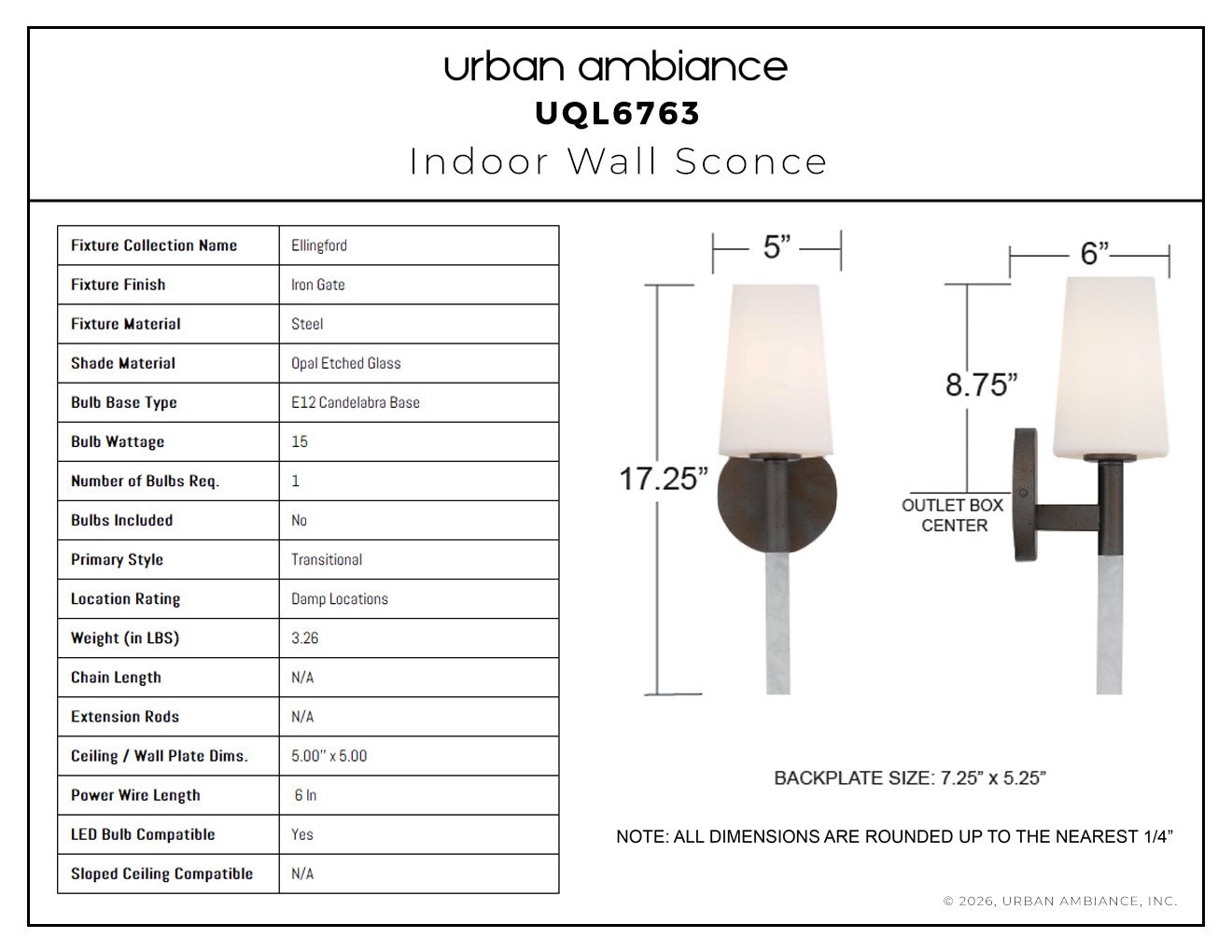 UQL6763 Transitional Indoor Wall Sconce, 17.25''H x 5''W x 6''Dep, Iron Gate Finish, Ellingford Collection