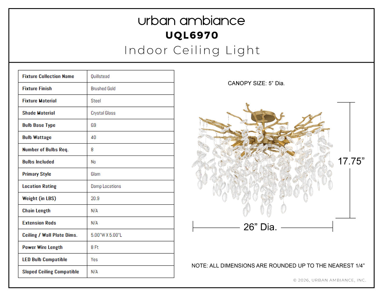 UQL6970 Glam Indoor Ceiling Light, 17.75''H x 26''W x 26''Dep, Brushed Gold Finish, Quillstead Collection