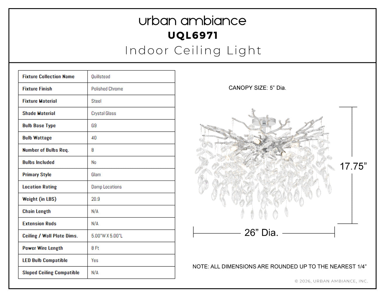 UQL6971 Glam Indoor Ceiling Light, 17.75''H x 26''W x 26''Dep, Polished Chrome Finish, Quillstead Collection