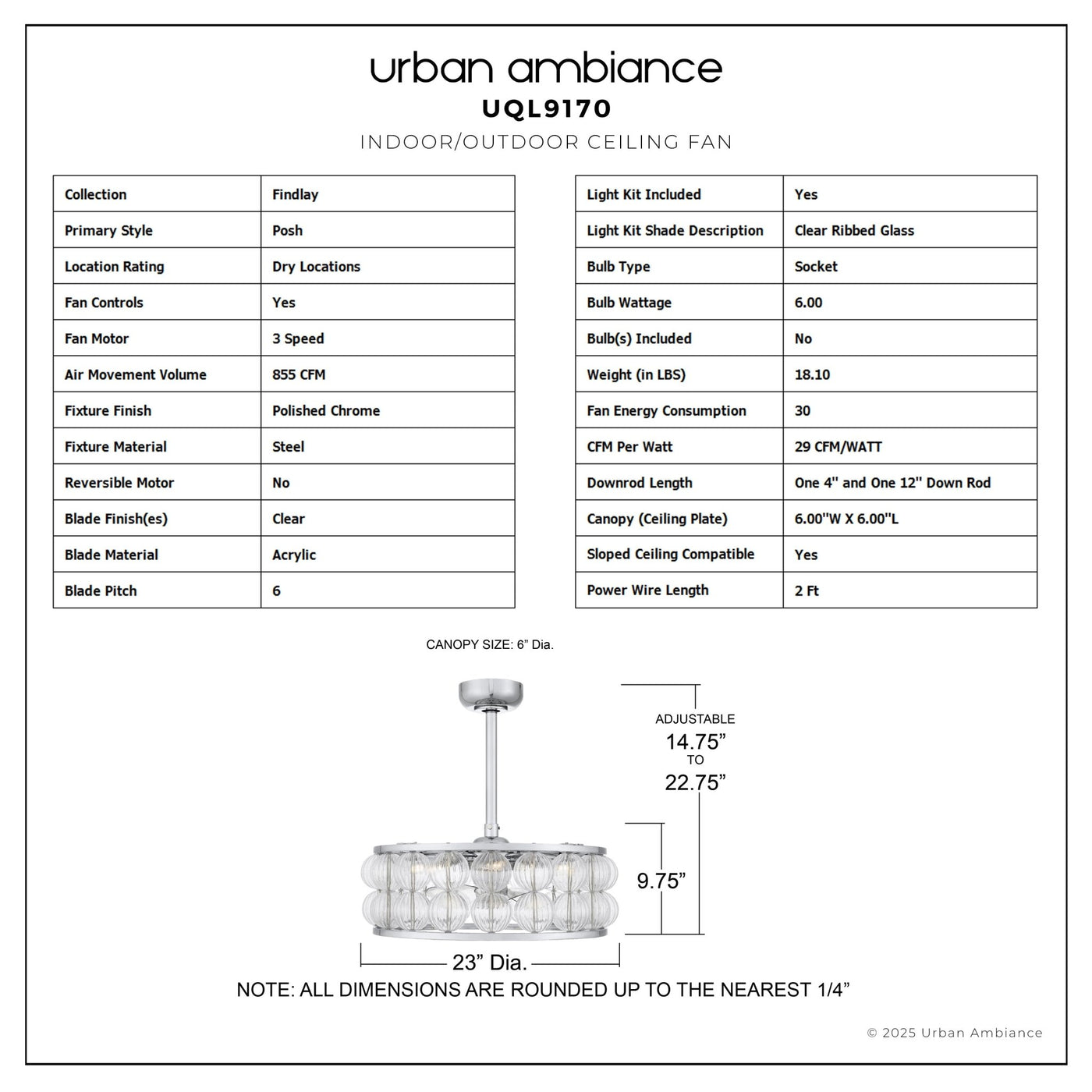 UQL9170 Contemporary Indoor Ceiling Fan, 9.75''H x 23.00''W x 23.00''Dep, Polished Chrome Finish, Findlay Collection