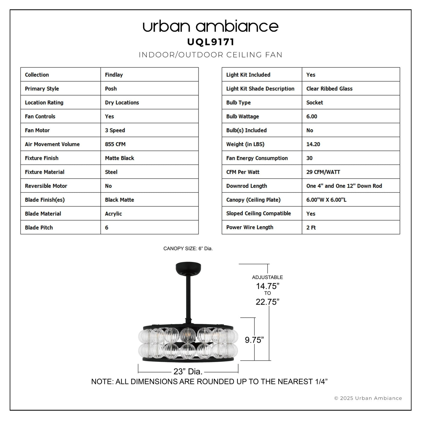 UQL9171 Contemporary Indoor Ceiling Fan, 9.75''H x 23.00''W x 23.00''Dep, Matte Black Finish, Findlay Collection