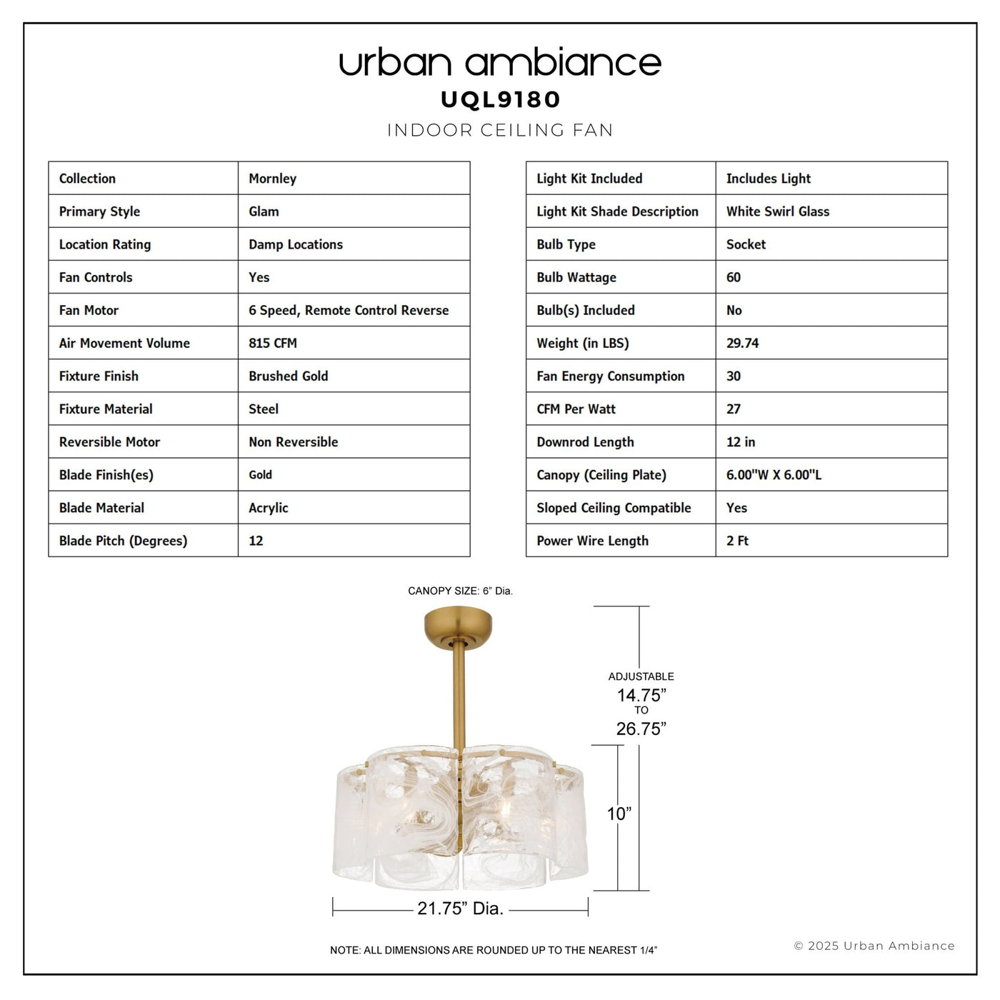 UQL9180 Glam Indoor Ceiling Fan, 10''H x 21.75''W x 21.75''Dep, Brushed Gold Finish, Mornley Collection
